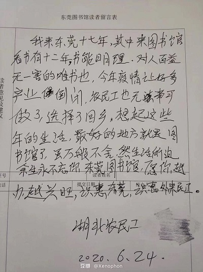 寫下這段話的是一位來自湖北的農(nóng)民工,6月24日,原本打算回老家的他,在去東莞圖書館辦理退卡時(shí),在留言表上寫下了這段話。25日深夜,總臺(tái)央廣記者獨(dú)家對(duì)話留言者吳先生,采訪中得知,在當(dāng)?shù)卣块T的幫助下,他不用和東莞圖書館道別了,26日,他將在東莞一個(gè)小區(qū)從事一份環(huán)衛(wèi)清潔工作。