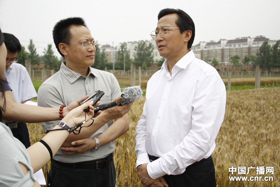 31日,中央臺《傾聽安徽》報道組赴合肥了解全國夏糧生產(chǎn)的總體形勢以及保障農(nóng)民權(quán)益的各項措施。圖為記者趙子忠在田間地頭采訪了農(nóng)業(yè)部部長韓長賦。(中廣網(wǎng)記者劉夢 攝)
