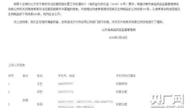 據(jù)悉,國家食藥監(jiān)總局18號局責(zé)成山東省食藥監(jiān)局會同公安和衛(wèi)生計生部門,立即查清疫苗等相關(guān)產(chǎn)品的來源和流向,并第一時間向社會公開相關(guān)信息。19號,山東省食藥監(jiān)局就公開了上下線人的準(zhǔn)確姓名和詳細(xì)電話。
