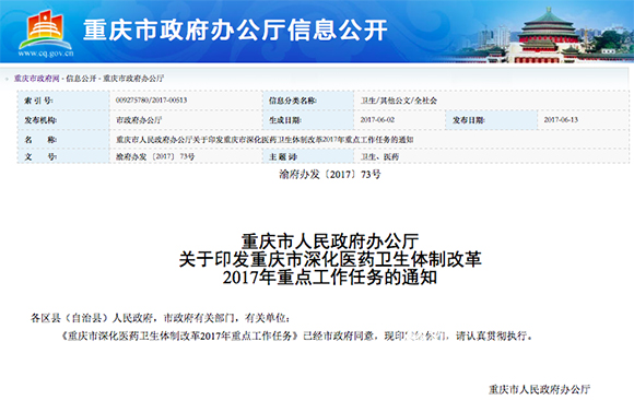 。ㄓ浾 黃宇)13日,重慶市政府網(wǎng)公布了《重慶市人民政府辦公廳關(guān)于印發(fā)重慶市深化醫(yī)藥衛(wèi)生體制改革2017年重點(diǎn)工作任務(wù)的通知》(以下簡(jiǎn)稱(chēng)《通知》),明確了全面推進(jìn)公立醫(yī)院綜合改革的時(shí)間和范圍,要求在2017年8月底前,所有公立醫(yī)院?jiǎn)?dòng)改革,全面取消藥品加成(中藥飲片除外),建立公立醫(yī)院由服務(wù)收費(fèi)和政府補(bǔ)助兩個(gè)渠道補(bǔ)償?shù)男聶C(jī)制,推動(dòng)新舊運(yùn)行機(jī)制平穩(wěn)轉(zhuǎn)換。
