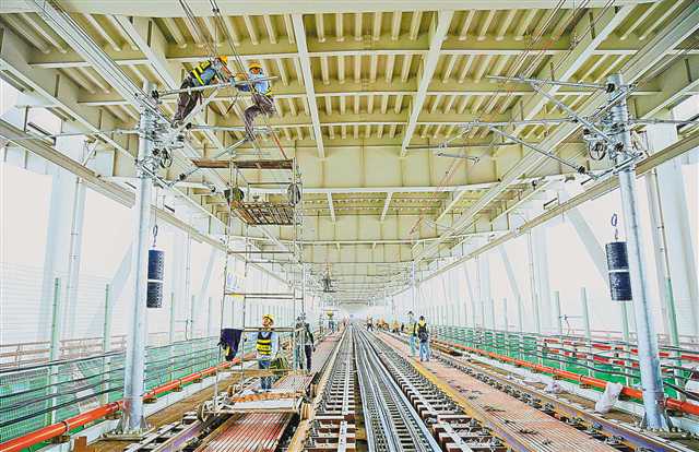 10月11日,軌道環(huán)線北半環(huán)朝天門(mén)長(zhǎng)江大橋段,建設(shè)工人正在進(jìn)行鋪軌后的機(jī)電安裝等施工。記者 羅斌 攝