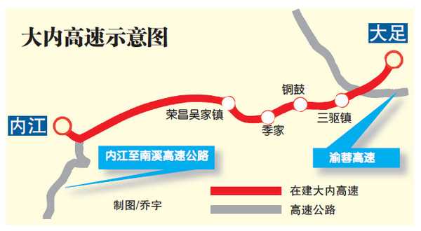 12月25日,重慶大足至四川內(nèi)江高速公路重慶段正式開工,建設(shè)工期3年。該高速建成通車后,經(jīng)渝蓉高速、大內(nèi)高速到內(nèi)江,比走成渝高速預(yù)計可節(jié)約半小時以上車程。