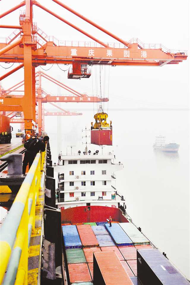 兩江新區(qū)果園港碼頭,集裝箱船正在裝貨。(重慶日報資料圖片)