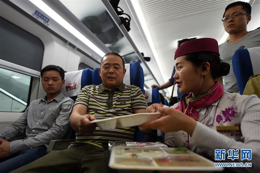 5月2日,在重慶火車北站,一位乘坐高鐵的旅客通過“成渝高鐵”微客服訂餐,乘務(wù)員按時(shí)將盒飯送至旅客的座位。新華社記者唐奕 攝