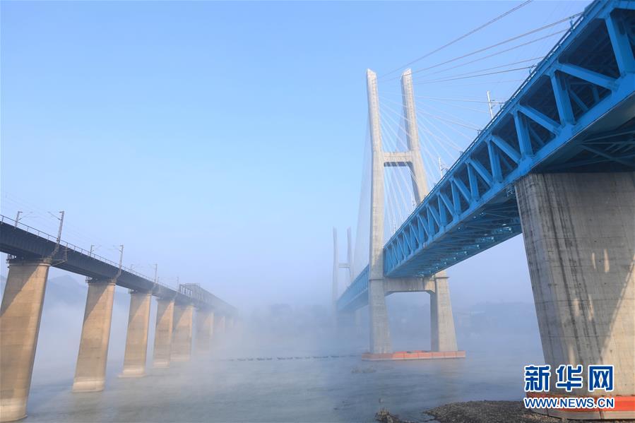 這是1月9日拍攝的新白沙沱長江特大橋(后)和修建于20世紀50年代的白沙沱長江大橋(前)。經(jīng)過5年艱苦建設,位于重慶江津的世界首座雙層六線鋼桁梁鐵路斜拉橋——新白沙沱長江特大橋近日落成,與即將開通的渝貴鐵路一起進入檢測試運行階段。新白沙沱長江特大橋全線長約5.32公里,其中主橋全長920米,是渝貴鐵路跨越長江的重要通道和關鍵控制性工程。該橋上層為四線客車線,設計時速200公里;下層為兩線貨車線,設計時速120公里。據(jù)介紹,渝貴鐵路開通后,列車通過這座大橋最快僅需16.56秒。新華社記者 劉潺 攝 -