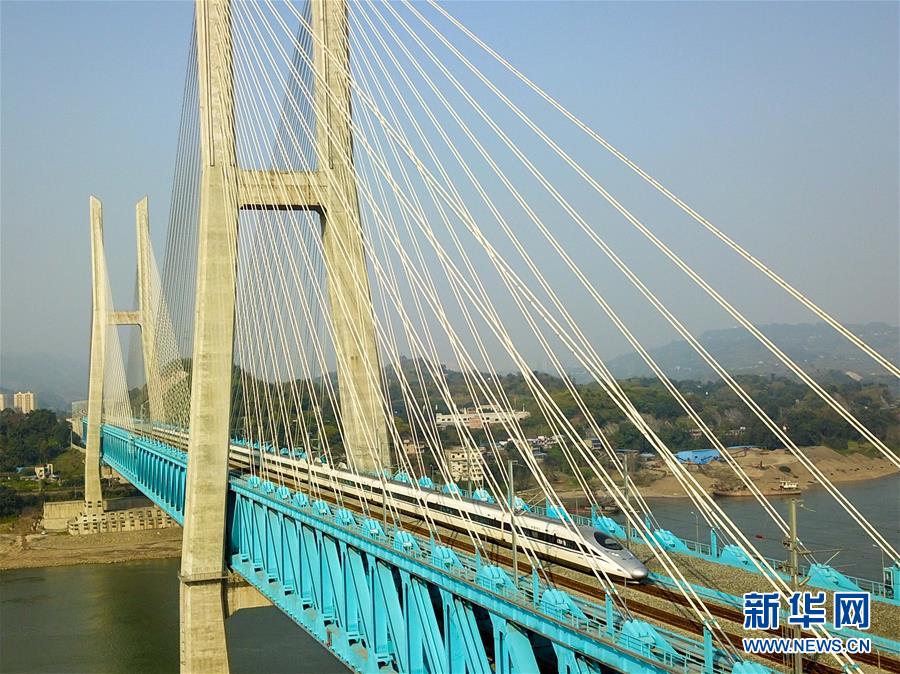 1月9日,一列動車組測試列車通過新白沙沱長江特大橋。經(jīng)過5年艱苦建設,位于重慶江津的世界首座雙層六線鋼桁梁鐵路斜拉橋——新白沙沱長江特大橋近日落成,與即將開通的渝貴鐵路一起進入檢測試運行階段。新白沙沱長江特大橋全線長約5.32公里,其中主橋全長920米,是渝貴鐵路跨越長江的重要通道和關鍵控制性工程。該橋上層為四線客車線,設計時速200公里;下層為兩線貨車線,設計時速120公里。據(jù)介紹,渝貴鐵路開通后,列車通過這座大橋最快僅需16.56秒。新華社記者 劉潺 攝 -