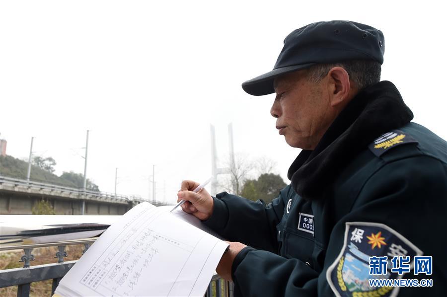 護路隊員伍勇春在位于新白沙沱長江特大橋旁的治安崗亭內(nèi)填寫巡查日志(2月6日攝)。今年已經(jīng)60歲的伍勇春是川黔鐵路線上的一名護路隊員,他常年駐守在橫跨于長江之上的白沙沱大橋旁,巡查線路隱患、提醒過往行人安全,被附近居民親切地稱為“守橋人”。2018年1月25日渝貴鐵路通車,與白沙沱大橋并行的新白沙沱長江特大橋同期投入使用,該橋是雙層六線鋼桁梁鐵路斜拉橋,也是渝貴鐵路線上的重要節(jié)點工程。為了保障新橋的安全運行,擁有豐富守橋護橋工作經(jīng)驗的伍勇春又被招為渝貴鐵路護路隊員,和他的團隊同時承擔起新舊兩座鐵路大橋的護衛(wèi)工作。新白沙沱長江特大橋擁有上下兩層總共6條客運、貨運鐵路線,伍勇春不僅要時刻巡查防止行人、動物進入大橋,還要經(jīng)常進入尚未投入運營的下層貨運鐵路線巡視安全、檢查設施設備是否正常。同時,伍勇春還要不時返回白沙沱大橋提醒過橋行人注意通行安全。工作量增加了,伍勇春卻從未抱怨過一句。在伍勇春看來,保障行人旅客安全、維護鐵路春運暢通是他這位“守橋人”應盡的職責。新華社記者 唐奕 攝 -