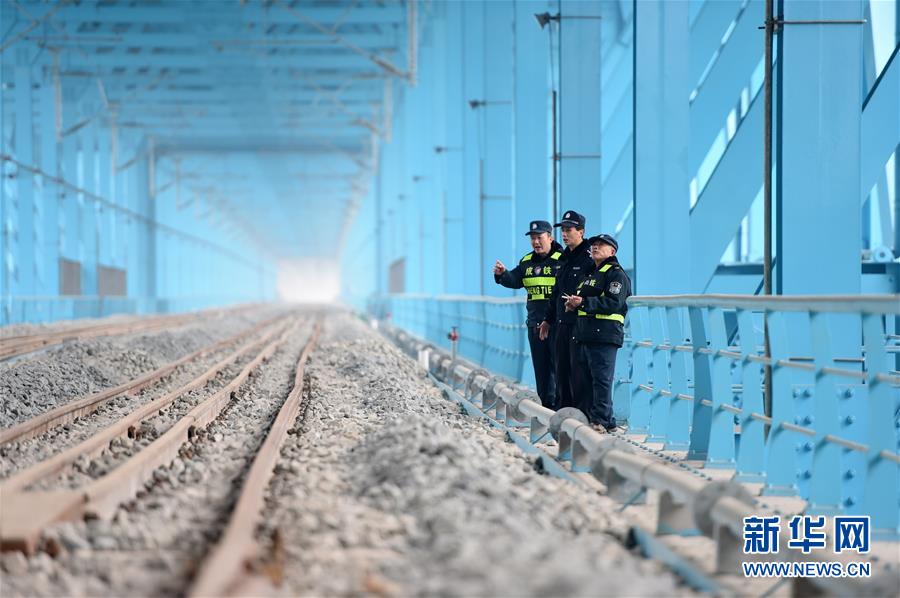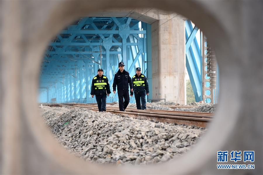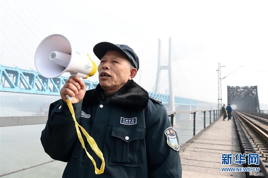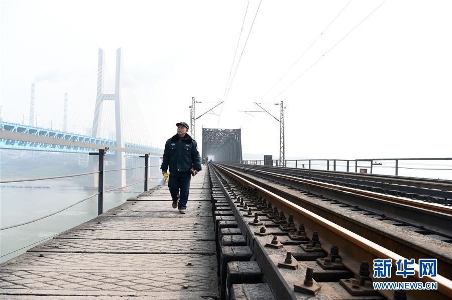 伍勇春在白沙沱大橋上巡查(2月6日攝)。今年已經(jīng)60歲的伍勇春是川黔鐵路線上的一名護路隊員,他常年駐守在橫跨于長江之上的白沙沱大橋旁,巡查線路隱患、提醒過往行人安全,被附近居民親切地稱為“守橋人”。2018年1月25日渝貴鐵路通車,與白沙沱大橋并行的新白沙沱長江特大橋同期投入使用,該橋是雙層六線鋼桁梁鐵路斜拉橋,也是渝貴鐵路線上的重要節(jié)點工程。為了保障新橋的安全運行,擁有豐富守橋護橋工作經(jīng)驗的伍勇春又被招為渝貴鐵路護路隊員,和他的團隊同時承擔起新舊兩座鐵路大橋的護衛(wèi)工作。新白沙沱長江特大橋擁有上下兩層總共6條客運、貨運鐵路線,伍勇春不僅要時刻巡查防止行人、動物進入大橋,還要經(jīng)常進入尚未投入運營的下層貨運鐵路線巡視安全、檢查設施設備是否正常。同時,伍勇春還要不時返回白沙沱大橋提醒過橋行人注意通行安全。工作量增加了,伍勇春卻從未抱怨過一句。在伍勇春看來,保障行人旅客安全、維護鐵路春運暢通是他這位“守橋人”應盡的職責。新華社記者 唐奕 攝