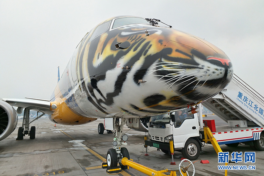 2月12日早上08:30分,一架外觀噴涂為老虎的巴西航空工業(yè)ERJ-190-E2客機降落重慶江北國際機場,在經(jīng)過近3小時停留加油后,于11:16分安全起飛前往哈薩克斯坦。據(jù)了解,這次停留主要是給飛機補充燃油。飛機從新加坡起飛,經(jīng)停重慶“吃飽喝足”后,飛往哈薩克斯坦阿拉木圖進行下一站演示。新華網(wǎng)發(fā)(重慶江北國際機場供圖) -