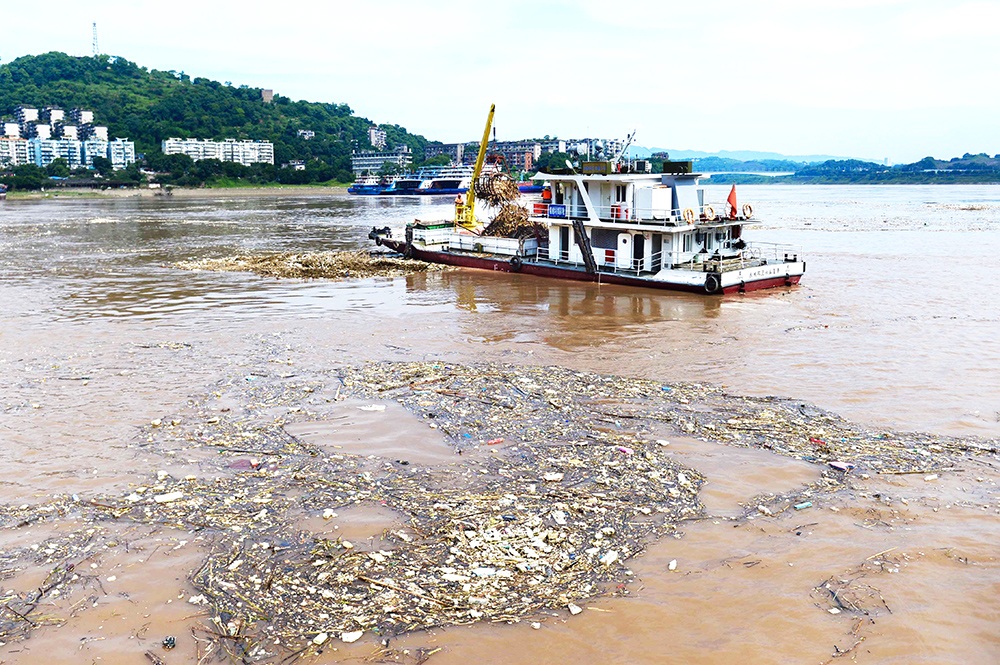 7月10日,長(zhǎng)江郭家沱滾裝船碼頭,水上環(huán)衛(wèi)工駕駛機(jī)械化專業(yè)清漂船抓取江面上的漂浮垃圾。隨著洪水過(guò)境,加之地勢(shì)原因,漂浮垃圾大量聚集在郭家沱水域。據(jù)介紹,這里的三艘機(jī)械化專業(yè)清漂船配備14名環(huán)衛(wèi)工,每天早上7點(diǎn)開(kāi)始作業(yè),一直要忙到天黑,每天清理垃圾近80噸,是平時(shí)的2.5倍。記者 張錦輝 攝