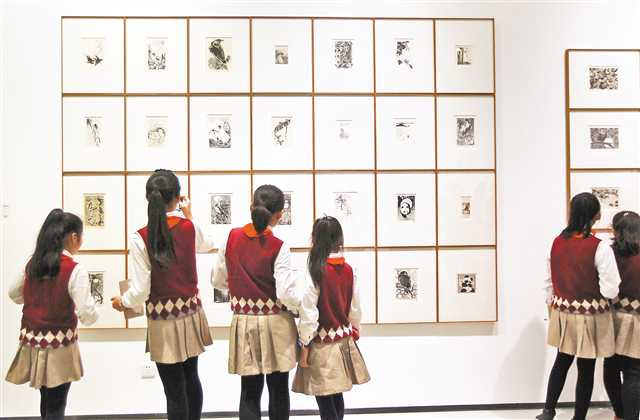 十一月一日,四川美術(shù)學(xué)院美術(shù)館,市民欣賞江敉先生版畫、漫畫等精品。記者 盧越 攝
