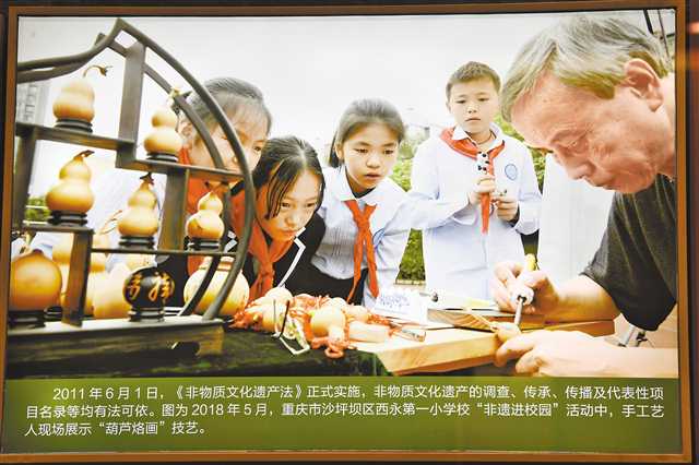 一位頭發(fā)花白的長者低著頭創(chuàng)作“葫蘆烙畫”,吸引了多名學(xué)生圍觀……在國家博物館“偉大的變革——慶祝改革開放40周年大型展覽”第四展區(qū)第三單元,一張“非遺進(jìn)校園”的照片引人注目。據(jù)了解,圖中的長者正是重慶市級非遺項目“葫蘆烙畫”的代表性傳承人張居常。