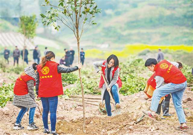 3月12日,萬盛經(jīng)開區(qū)萬東鎮(zhèn),人們在荒山坡上植樹造林。近年來,萬盛加快采煤沉陷區(qū)生態(tài)環(huán)境修復(fù),開展規(guī)模植綠行動和礦山地質(zhì)環(huán)境治理,將綠色還給礦山。