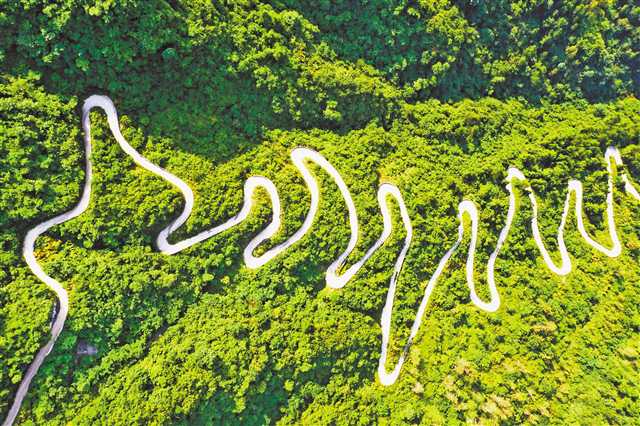 這條路位于海拔1500多米的小朝門山,蜿蜒盤旋,有41道拐,甚是壯觀。這條扶貧公路不僅帶動了當?shù)氐漠a(chǎn)業(yè)發(fā)展,也逐漸成為一條各地游客關注的自駕游公路。(特約攝影 楊敏)
