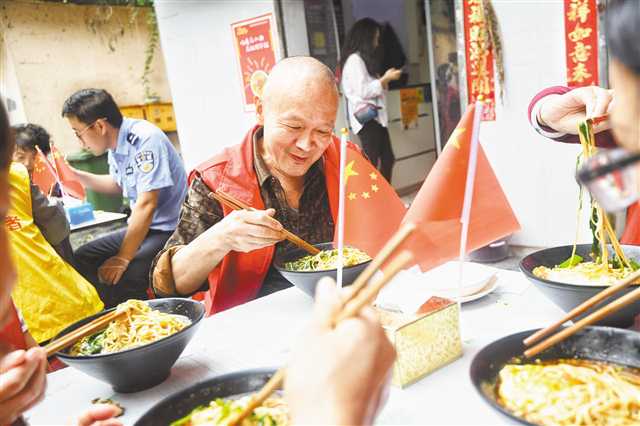 9月29日,大渡口區(qū)躍進(jìn)村街道,參與疫情防控、抗洪搶險(xiǎn)的優(yōu)秀志愿者、醫(yī)護(hù)人員、社區(qū)民警、城管執(zhí)法隊(duì)員等同吃“國(guó)慶面”。首席記者 崔力 攝