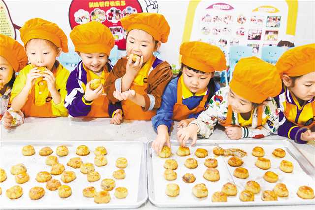 9月29日,北碚區(qū)實(shí)驗(yàn)幼兒園,孩子們?cè)诶蠋熤笇?dǎo)下親手制作月餅。特約攝影 秦廷富