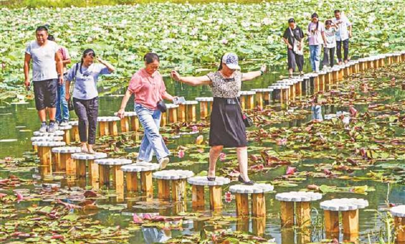 武隆區(qū)滄溝鄉(xiāng)大田濕地人家鄉(xiāng)村旅游點,游客走在步游道上欣賞荷花。(攝于2020年8月13日)記者 龍帆 栗園園 攝/視覺重慶