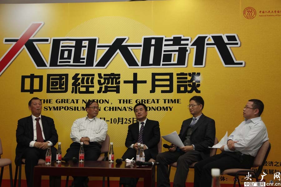 10月16日,由經(jīng)濟之聲、央廣網(wǎng)主辦的《大國大時代----中國經(jīng)濟十月談》系列時事報告會之四“價格談”,在人民大學(xué)舉行。圖為圖為國務(wù)院參事室特約研究員姚景源、國家信息中心首席經(jīng)濟師范劍平、國家發(fā)改委價格司副司長周望軍、中國人民大學(xué)財政金融學(xué)院副院長趙錫軍、經(jīng)濟之聲觀察員陳愛海(由左至右排序)(央廣網(wǎng) 趙娜娜/攝)