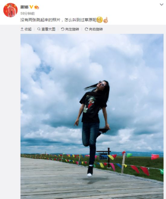 7月1日中午,謝娜曬出兩張在草原拍攝的美照,并寫道:“沒有兩張?zhí)饋淼恼掌,怎么叫到過草原呢。”照片中,謝娜高高地跳起,“太陽女神”又瘦又美。