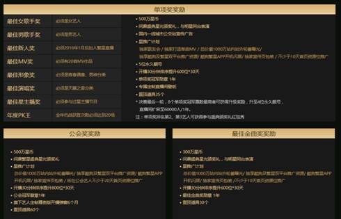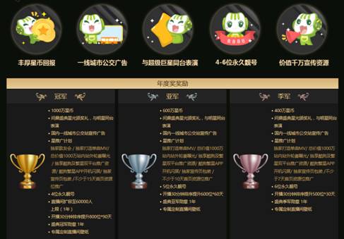 與往年相比,今年的盛典總決選陣容更加華麗浩大。面對(duì)井噴式增長的用戶和藝人,酷狗繁星直播不斷嘗試新的方式,來吸納發(fā)掘更多有潛質(zhì)的優(yōu)秀音樂藝人,今年總決選更增設(shè)了最佳MV獎(jiǎng)、最佳星主播獎(jiǎng)和年度PK王等多個(gè)單項(xiàng)獎(jiǎng)。同時(shí),獎(jiǎng)勵(lì)大升級(jí),豐厚到令人難以置信!除了百萬星幣獎(jiǎng)勵(lì)之外,還提供價(jià)值千萬的全國一線城市廣告宣傳,真正讓優(yōu)秀的繁星藝人實(shí)現(xiàn)夢(mèng)想。