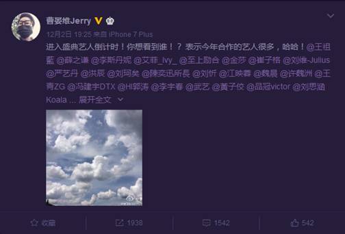 有網(wǎng)友指出,@曹晏維Jerry并沒有@任何一個繁星藝人,難道本次盛典沒有繁星藝人登臺?事實上,2016酷狗直播繁星音樂盛典的繁星藝人出席名單將從盛典總決選中誕生。