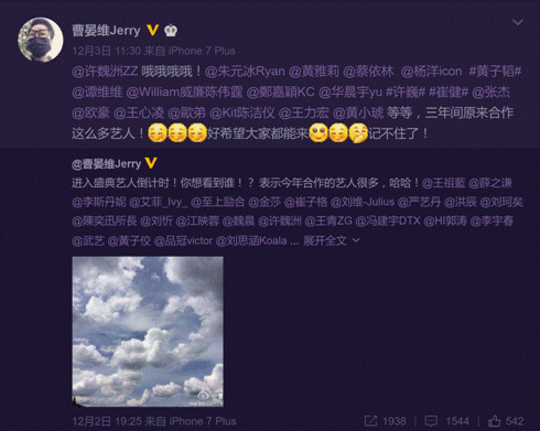 不料隨后@曹晏維Jerry再次發(fā)微博表示:“三年間原來合作了這么多藝人,好希望大家都能來!”又附上一份長長的明星大咖名單。網(wǎng)友只能表示:“走過最深的路,就是你的套路”?磥2016酷狗直播繁星音樂盛典的明星出席名單仍然深埋在一片迷霧中,不過無論如何,@曹晏維Jerry都為大家劃定大致范圍了,至于究竟有誰?粉絲們還是乖乖等官方消息吧~