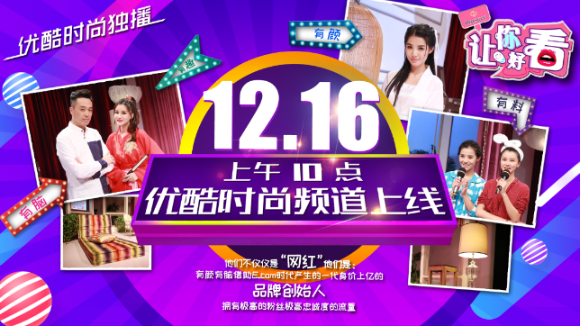 此次《讓你好看》獨(dú)家落戶優(yōu)酷時(shí)尚頻道,與優(yōu)酷時(shí)尚主打覆蓋的年輕女性消費(fèi)群體不謀而合。此前,優(yōu)酷時(shí)尚已成功打造 “十全十美”紅人帶,通過引入貝克漢姆、奚夢(mèng)瑤、米歇爾·范、PONY、唐毅、愛玩大表哥等在內(nèi)的自頻道主入駐,為年輕女性分享最新最潮時(shí)尚資訊和變美秘籍!蹲屇愫每础返莫(dú)家落戶,是優(yōu)酷時(shí)尚打造美妝網(wǎng)紅生態(tài)的又一美好嘗試。每周五獨(dú)家鎖定優(yōu)酷時(shí)尚,讓你好看。(點(diǎn)擊前往:http://v.youku.com/v_show/id_XMTg2NTYwODY2MA==.html?spm=a2hzp.8253869.0.0&from=y1.7-2)