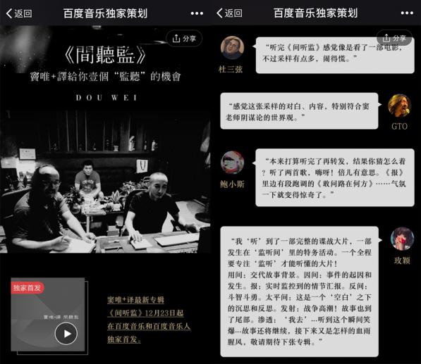 23日專輯首發(fā)后,百度音樂(lè)就發(fā)起了“竇唯+譯給你一個(gè)‘監(jiān)聽’的機(jī)會(huì)”專題活動(dòng),引導(dǎo)用戶發(fā)布從《間聽監(jiān)》中“監(jiān)聽”到的內(nèi)容評(píng)論,不少人都在專題后留下了自己的感受。