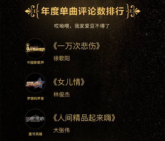【年度單曲評論數(shù)排行:《一萬次悲傷》、《女兒情》、《人間精品起來嗨》】