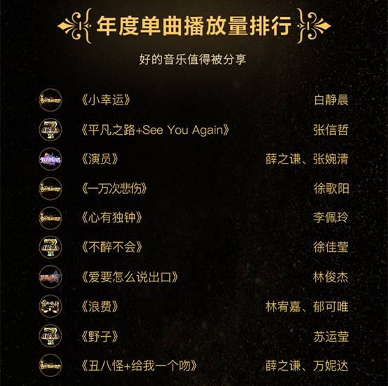 小鮮肉白靜晨的《小幸運》、情歌王子張信哲的《平凡之路+See You Again》、謙謙君子薛之謙與素人張婉清合唱的《演員》,一舉斬獲酷狗年度單曲播放量排行榜前三。而行走的CD林俊杰與汪峰愛徒徐歌陽,繼年度單曲評論數(shù)排行榜后,再次實力入選年度單曲播放量排行榜!