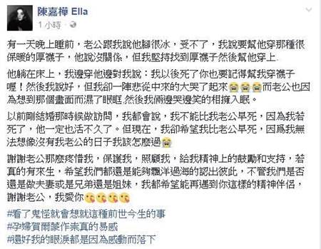 Ella透露某天睡前,老公跟她說腳很冰,她本想幫他穿上保暖厚襪子,但對方卻說沒關(guān)系,不過她還是堅持找到厚襪子幫他穿上,過程中賴斯翔說“我以后死了你也要記得幫我穿襪子哦”,沒想到她卻一陣悲從中來的大哭起來,連老公也因想到畫面而濕了眼眶,兩人最后邊哭邊笑的相擁入眠。