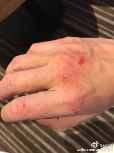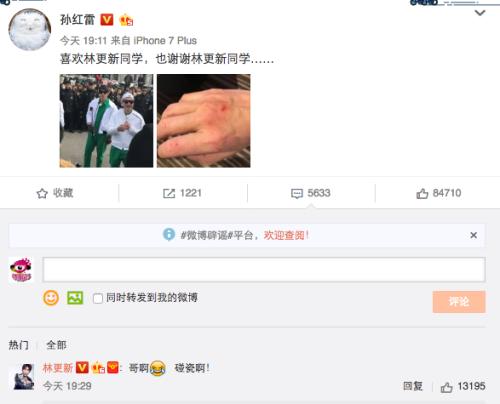 日前,孫紅雷分享了和林更新一起錄制《極限挑戰(zhàn)》的照片,并一同曬出自己擦傷明顯、多處流血的右手,配文稱(chēng):“喜歡林更新同學(xué),也謝謝林更新同學(xué)……”林更新隨后轉(zhuǎn)發(fā)并回復(fù)孫紅雷,“哥啊,碰瓷!”圖片中,孫紅雷與林更新正在錄制中,孫紅雷舉起右手指點(diǎn)傷疤,嬉笑著和面前的人解釋?zhuān)指挛挥谒砗,看不出表情?/p>