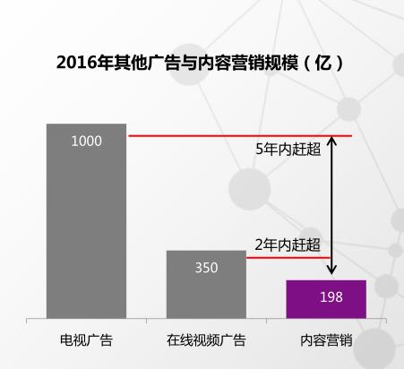 《娛樂(lè)內(nèi)容營(yíng)銷白皮書》指出,內(nèi)容營(yíng)銷規(guī)模在2016年已有近200億!2016年在線視頻廣告的規(guī)模為350億,電視廣告規(guī)模則為1000億左右,內(nèi)容營(yíng)銷廣告在未來(lái)3-5年可能會(huì)超過(guò)電視廣告這樣一個(gè)量級(jí)和規(guī)模!眲⒋淦颊f(shuō)。