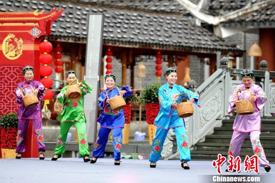 圖為鄉(xiāng)村春晚上根據(jù)福建永定傳統(tǒng)民俗活動“搶春!本巹(chuàng)的節(jié)目《迎春!!埍蟆z