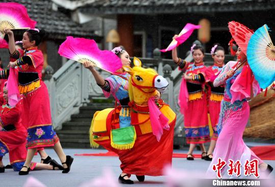 圖為鄉(xiāng)村春晚上表演的流行于閩西長汀縣、有農(nóng)村生活寫照特點和濃厚的鄉(xiāng)土氣息的民俗舞蹈《踩馬燈》!埍 攝