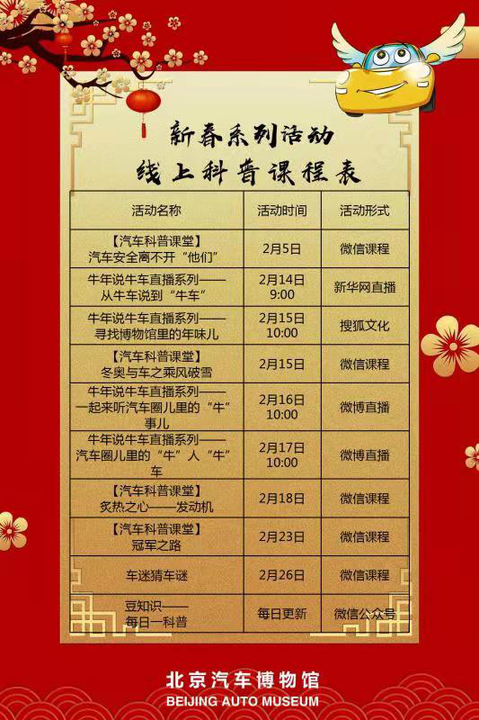 據(jù)北京汽車博物館相關(guān)負(fù)責(zé)人介紹,初三至初六以“牛年說牛車”為主題,每天一場直播講述汽車圈兒里的“!避嚒⑴H、牛事兒。初三,科普老師講帶領(lǐng)大家從古代的牛車講到現(xiàn)在的“牛”車;初四,汽車博物館工作人員將帶領(lǐng)大家尋找汽博館里的年味兒,逛一逛博物館里的新春文創(chuàng)節(jié);初五,講解員以角色扮演的方式為大家?guī)硪粓銮榫笆街v解;初六,以新年特展“那些年,在路上”為主線帶大家看一看各個年代的經(jīng)典車型,聊一聊汽車圈兒里的“牛”人“!笔聝骸