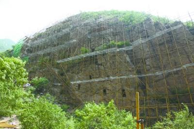 姚家營洞穴遺址近日啟動修繕,崖壁外側(cè)搭建起高48米、寬130米的腳手架。延慶區(qū)文委供圖