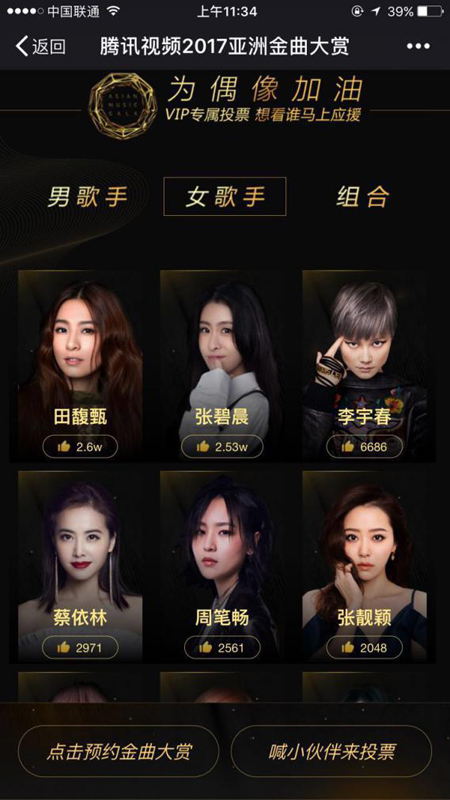 騰訊視頻LiveMusic作為在線演唱會第一平臺,與MTV音樂電視臺繼續(xù)強(qiáng)強(qiáng)聯(lián)合,攜手舉辦2017亞洲金曲大賞,互聯(lián)網(wǎng)基因和傳統(tǒng)音樂因素結(jié)合,開啟又一場無與倫比的互聯(lián)網(wǎng)音樂盛典。目前投票頁面已經(jīng)進(jìn)入最后開放階段,考驗(yàn)最燃粉絲的時刻到了,愛TA你就動動手指投票送TA去現(xiàn)場!