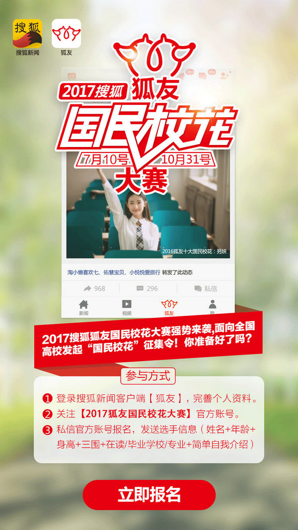 參賽要求十分簡單:在校大學生或畢業(yè)3年內的女生,只需要“登錄”狐友完善個人資料,并關注“2017狐友國民校花大賽”官方賬號,私信發(fā)送報名信息(學校/畢業(yè)學校、三圍、身高、年齡),3天之內,與官方賬號“2017狐友國民校花大賽”互關,即可獲得參加海選的資格。