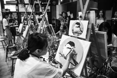 走出陶藝社不遠(yuǎn),“同或”繪館迎面而至。找一塊尺寸合適的畫(huà)布,支起畫(huà)架,就可以在畫(huà)布上隨心所欲創(chuàng)作了。一位沒(méi)有任何繪畫(huà)基礎(chǔ)的女生花了三個(gè)小時(shí)就點(diǎn)染出一幅“桃花圖”。店家半開(kāi)玩笑說(shuō),她的畫(huà)作頗有幾分知名畫(huà)家周春芽的影子,后者的“桃花”系列是國(guó)內(nèi)藝術(shù)拍賣(mài)場(chǎng)的熟客。從繪畫(huà)館出門(mén)轉(zhuǎn)個(gè)彎兒,就是一家舞蹈培訓(xùn)室,幾乎每天都有七八人在這里練習(xí)國(guó)標(biāo)、探戈或是拉丁,教師悉數(shù)為科班出身。