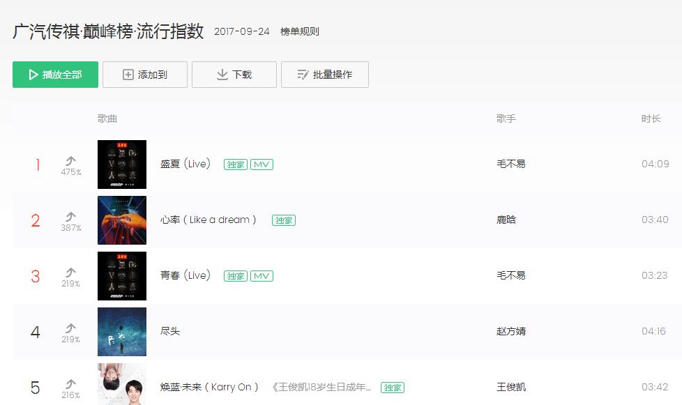 對于選手們精彩絕倫的表現(xiàn),網(wǎng)友們紛紛通過QQ音樂、酷狗音樂、酷我音樂應(yīng)援打氣,999+熱評歌曲不斷涌現(xiàn),熱評點贊數(shù)更是動輒破萬。最終,在人氣值比拼中,毛不易以微弱優(yōu)勢打敗馬伯騫,眾望所歸贏得《明日之子》最強廠牌殊榮,獲得白金唱片,奪冠曲《盛夏》更是力壓鹿晗和王俊凱、躥上QQ音樂巔峰榜流行指數(shù)榜首。從盛夏到初秋,在《明日之子》的未來偶像孵化過程中,騰訊音樂娛樂也充分玩轉(zhuǎn)“聽看唱玩”的“鵝式綜藝精神”,為粉絲們打造極具凝聚力的立體參與感。