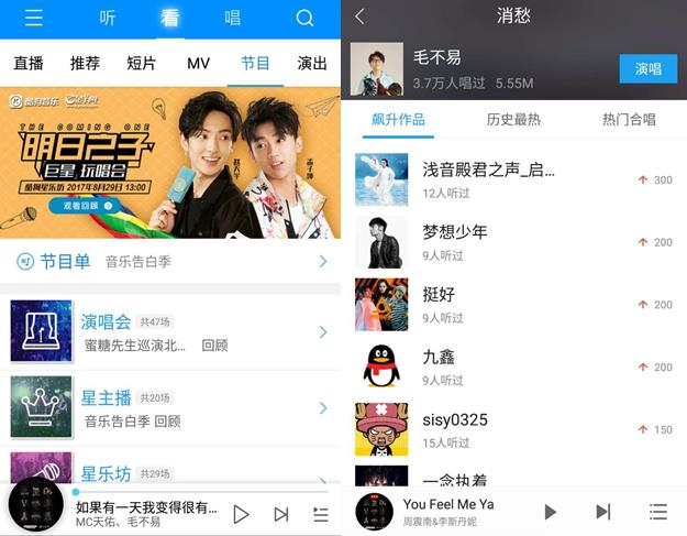除了有同步節(jié)目進度的王牌功能“零時差專輯”帶來一手好音樂,騰訊音樂娛樂彈幕、熱評多管齊下,也為粉絲們提供了邊聽邊聊的應(yīng)援、熱議陣地,實時反饋選手人氣的權(quán)威榜單更是為粉絲們提供了選手晉級幾率的直觀參考。此外,酷狗星樂坊、QQ音樂唱反調(diào)電臺等王牌欄目的“突襲”,也不定時讓選手們“空降”到網(wǎng)友面前,酷狗酷我便捷的K歌、直播頻道也為粉絲們一解了歡唱偶像歌曲的K歌癮。