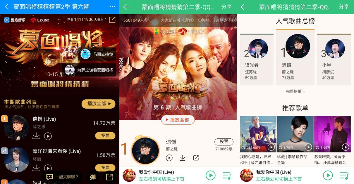 在當(dāng)晚的節(jié)目中,率先征戰(zhàn)的“風(fēng)中凌亂的小公舉”頭頂小風(fēng)車,以一曲純凈通透的《漂洋過海來看你》感動全場,由于陶晶瑩的缺席,猜評團(tuán)甚至一度認(rèn)為就是陶子姐。不過憑借獨特的聲音特質(zhì),“來自東北的馬麗”還是在采訪環(huán)節(jié)被認(rèn)出真“聲”,對于其“被喜劇掩蓋的音樂天賦”,QQ音樂網(wǎng)友也表示驚艷。而另一位新晉登臺的“刺”也遭聲線“出賣”,一張口就被認(rèn)出是薛之謙本人,一曲《遺憾》唱盡悲歡離合,不僅與馬麗雙雙登上酷狗音樂蒙面唱將猜猜猜的人氣榜前兩位,更以68萬票“空降”QQ音樂當(dāng)期人氣歌曲榜和人氣歌曲總榜冠軍,成為最強(qiáng)補(bǔ)位唱將。