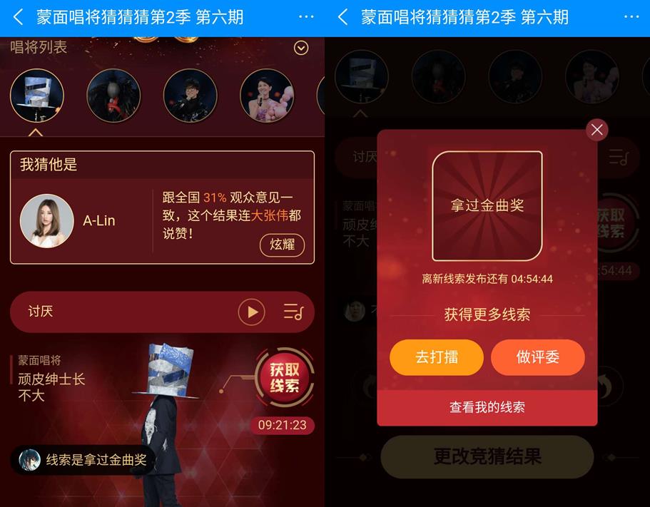 在繼第四期節(jié)目怒揭5面之后,周日剛剛落下帷幕的《蒙面唱將猜猜猜》第二季第六期節(jié)目再度“連中五員”。通過零時差高品質(zhì)純享音頻和新鮮有趣的互動和獨家線索,節(jié)目獨家音頻合作方騰訊音樂娛樂集團(tuán)旗下QQ音樂、酷狗音樂、酷我音樂吸引了大批網(wǎng)友前來集思廣益,不僅一舉揭開了困擾大家兩周的“淘氣的粉紅女王”李慧珍的神秘面紗,“何必在乎我是誰”蘇慧倫、“人間極品小魔頭”劉維,新晉補(bǔ)位的“風(fēng)中凌亂的小公舉”馬麗,“刺”薛之謙也都接連猜中。