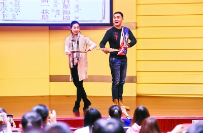 上海昆劇團演員黎安(右)、羅晨雪為學子們現(xiàn)場表演 記者許魏巍 攝