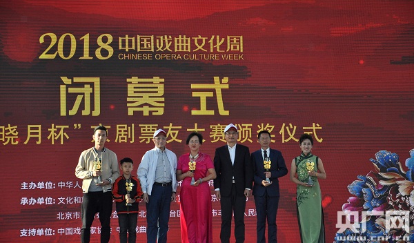 央廣網北京10月8日消息(記者王子衿 安紅麗)10月7日下午,北京園博園三號門廣場鑼鼓陣陣,2018中國戲曲文化周閉幕式暨“曉月杯”京劇票友大賽(以下簡稱票友大賽)頒獎儀式舉行,大賽總決賽金銀銅獎及各項單項獎揭曉,鄭蘭菊、田建才、張?zhí)m芝從成人組勝出,少兒組、海外組金獎分別由程柯睿、Antti Silvennoinen摘得。