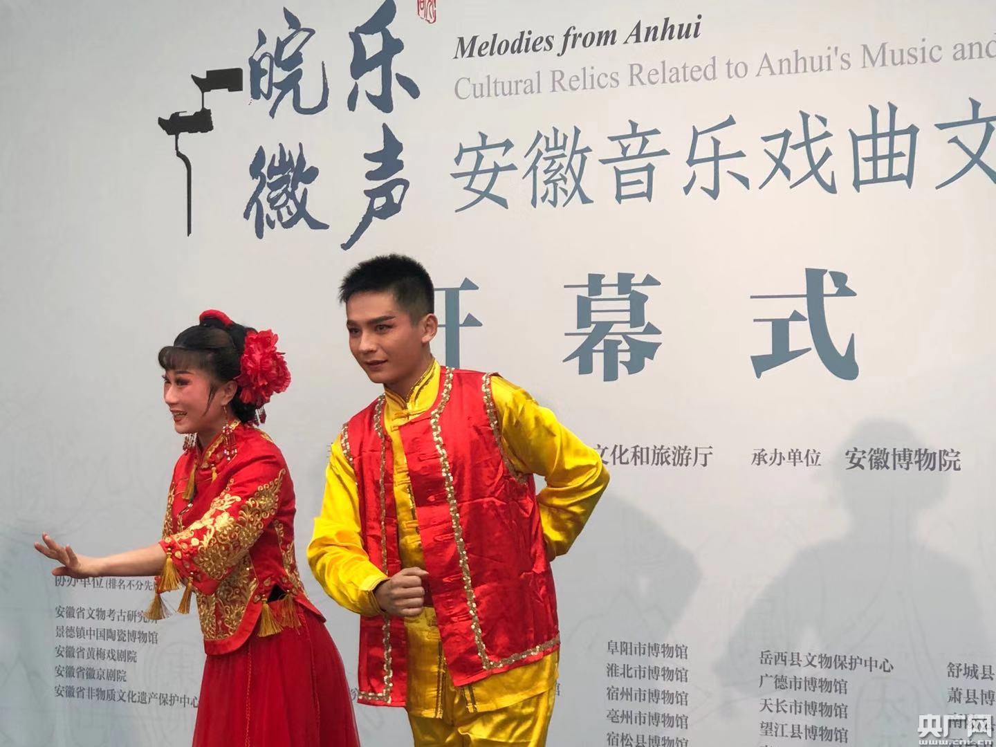 安徽得占地利,各種戲曲藝術(shù)在地域文化的滋養(yǎng)下融合吐納,孕育發(fā)展出眾多地方聲腔。從商周的鐘鼓之樂(lè),至漢唐的樂(lè)舞百戲、說(shuō)唱,再到宋元明清的戲曲藝術(shù),安徽多姿多彩的音樂(lè)戲曲文化跟隨時(shí)代的步伐一路向前,時(shí)至今日仍活躍于舞臺(tái)之上,豐富著人民的精神文化生活。開(kāi)幕式當(dāng)天,受邀參加開(kāi)幕式的百余位來(lái)賓共同欣賞了由蕪湖縣黃梅戲劇團(tuán)帶來(lái)的黃梅戲表演,淳樸流暢的唱腔、質(zhì)樸細(xì)膩的表演,展現(xiàn)出黃梅戲的獨(dú)特魅力。隨后,在安徽博物院保管部主任徐大珍的導(dǎo)覽下,一幅安徽省音樂(lè)、戲曲藝術(shù)畫(huà)卷在所有觀者面前徐徐展開(kāi)。