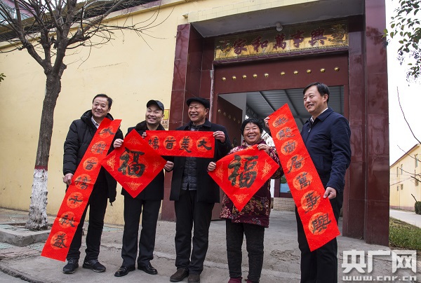 根據(jù)結(jié)尾字聲調(diào)的平仄區(qū)分出上聯(lián)和下聯(lián)后,還需注意張貼的形式。當(dāng)人們面對(duì)春聯(lián)時(shí),上聯(lián)在右首,下聯(lián)在左首。兩聯(lián)呈對(duì)稱的形式,貼在相對(duì)的位置。事實(shí)上,這多是對(duì)“框?qū)Α保ㄙN在左右門框上的春聯(lián))和“門心”(貼在左右門板上方居中位置的春聯(lián))的張貼要求。但“門心”與“框?qū)Α边略有不同。在書寫形式上,“門心”的兩聯(lián)各有兩列字,上聯(lián)是由右往左書寫,下聯(lián)是由左往右書寫,兩聯(lián)相對(duì)。張貼出去,像繁體的“門”字。比如,人們面對(duì)七言的“門心”時(shí),春聯(lián)兩側(cè)各是四言,中間則是三言。如果稍加關(guān)注“門心”的平仄格式和書寫形式,一般不易張貼錯(cuò)誤。