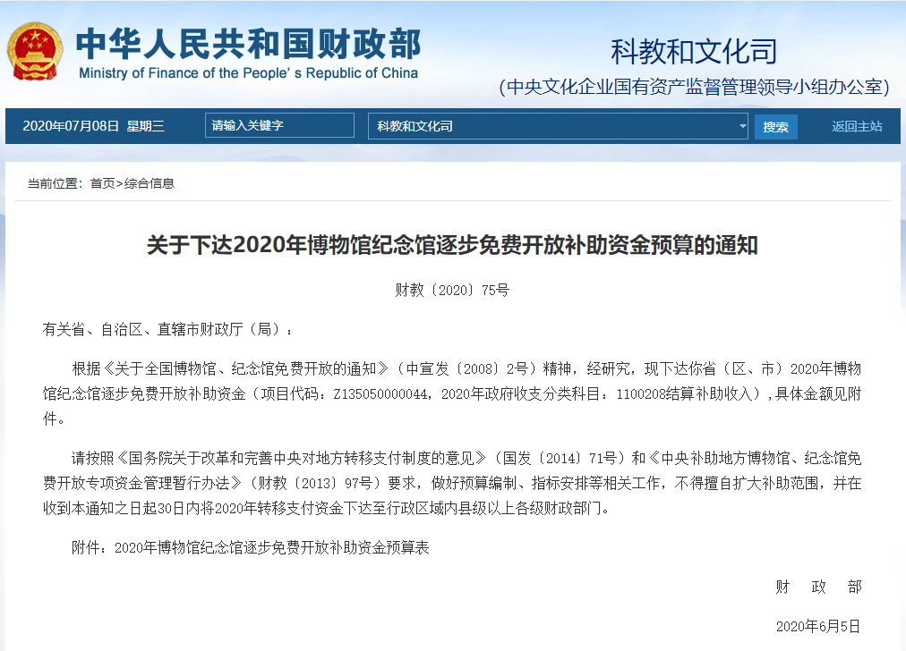 《通知》強(qiáng)調(diào),各。▍^(qū)、市)需按照《國(guó)務(wù)院關(guān)于改革和完善中央對(duì)地方轉(zhuǎn)移支付制度的意見(jiàn)》(國(guó)發(fā)〔2014〕71號(hào))和《中央補(bǔ)助地方博物館、紀(jì)念館免費(fèi)開(kāi)放專(zhuān)項(xiàng)資金管理暫行辦法》(財(cái)教〔2013〕97號(hào))要求,做好預(yù)算編制、指標(biāo)安排等相關(guān)工作,不得擅自擴(kuò)大補(bǔ)助范圍,并在收到《通知》之日起30日內(nèi)將2020年轉(zhuǎn)移支付資金下達(dá)至行政區(qū)域內(nèi)縣級(jí)以上各級(jí)財(cái)政部門(mén)。