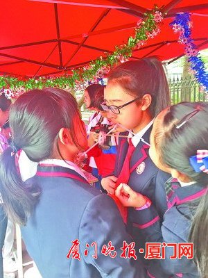 六年(2)班的陳錦璇和賴鷺宸在攝影社的攤位前玩起游戲,她們嘴里含著吸管,用吸管傳遞一個(gè)透明膠。經(jīng)過(guò)了三分鐘的嘗試,她們終于圓滿完成了任務(wù)!白彀投妓崴览玻 标愬\璇開(kāi)心地說(shuō),工作人員在她們的積分卡上蓋了一個(gè)小紅章,據(jù)說(shuō),完成任務(wù)蓋滿12個(gè)紅章就可以拿到獎(jiǎng)品了。